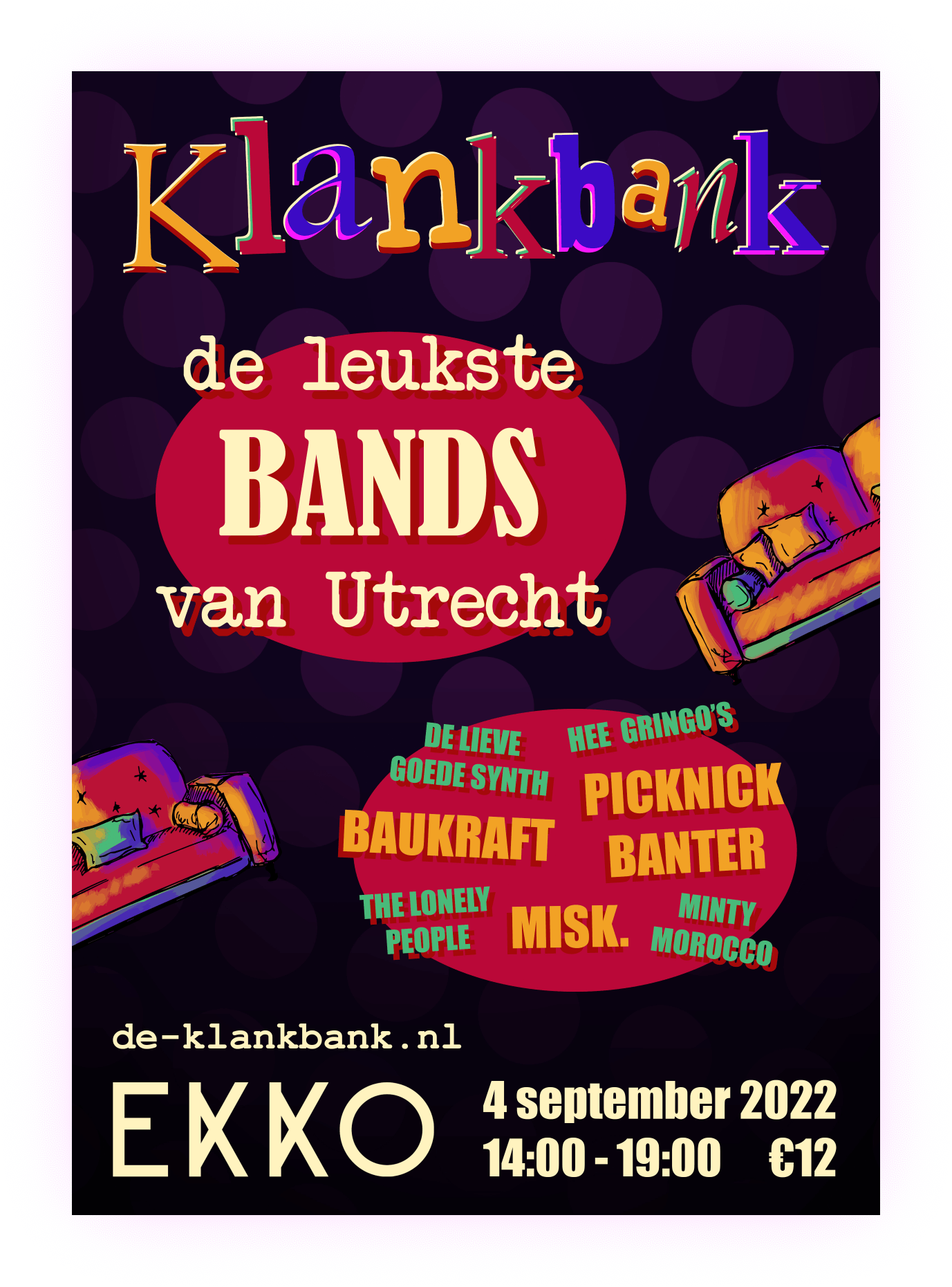Markeer 4 september met kleurrijke stift in je agenda, want dan gaat een bonte verzameling bands voor een middag lang muzikaal vermaak zorgen tijdens De Klankbank 2022! We hebben een line-up met voor ieder wat wils: van voetjes-van-de-vloer synthpop en scheurende rock, tot verrassende indie en rustgevende folk. Niet alleen coverbands, maar ook beginnende bands met eigen materiaal zullen de revue passeren... wie weet wel als opstapje naar grotere podia! Deze variatie maakt De Klankbank tot een uniek concept dat zich in 2019 al dubbel en dwars bewezen heeft. Maar dat willen we graag nog een keer doen, dus komt dat zien, en help mee om deze editie wederom tot een daverend succes te maken! Het concert is ditmaal in EKKO in Utrecht en de kaartverkoop is gestart, dus koop nu je ticket hier! Zie onze social media voor updates!